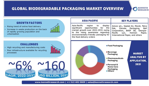 世界の生分解性包装市場は、2031年までに約1,600億米ドルの収益を獲得する見込み。オンライン食品配送の増加傾向、および市場の成長を促進する廃棄物生産の増加