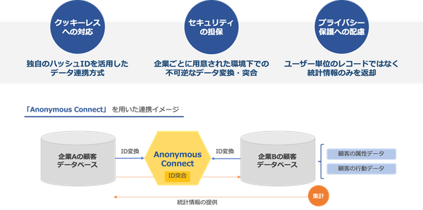 自社で独自に同様の仕組みを用意したいという企業様向けに、「Anonymous Connect」をベースとしたデータクリーンルームの提供が可能です。
