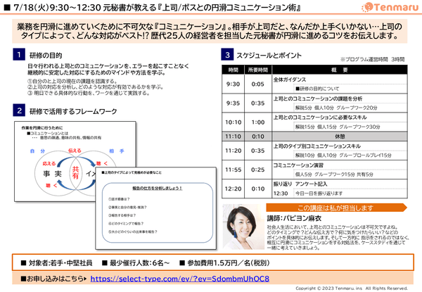 組織づくりや人材教育・キャリア開発、人材採用支援を行う株式会社Tenmaru(本社:東京都港区、代表取締役:諸戸 歩)は、2023年7月、上司とのより良いコミュニケーションを目指す若手・中堅社員を対象としたオンライン公開講座を行います。緊張感や苦手意識から伝わらない状況を脱し、仕事も円滑に進むためのコツを学びます。