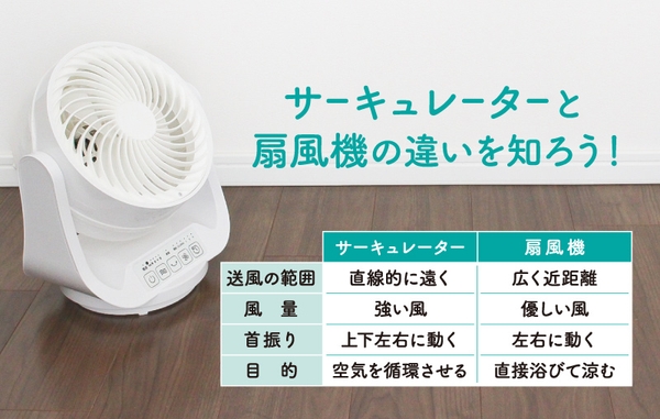 サーキュレーターと扇風機の違いは、送風の範囲と風量です。扇風機は暑い時に人が涼しむためのものなので、広く近距離に優しい風が送れるのが特徴です。一方、サーキュレーターは空気を循環させるために作られたものなので、直線的に遠くまで強い風を送ることができます。