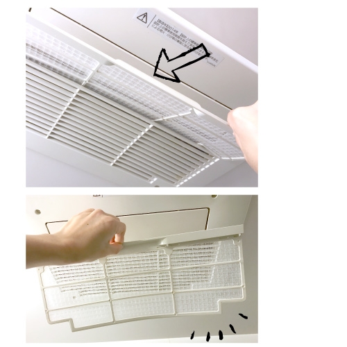 浴室乾燥機の中には備え付けのフィルターが付いています。矢印の部分をスライドして引っ張り出してみてください。