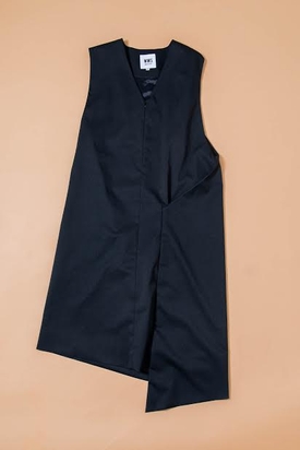 アシンメトリーなデザインが特徴的なワンピースは、フロントのセンターラインや深めのVネックで細見えにも効果的。外見崩れがしない設計で、大きなポケットも嬉しいポイント。アクセサリーなど小物でアレンジすれば、お呼ばれ服としても重宝する一着。
