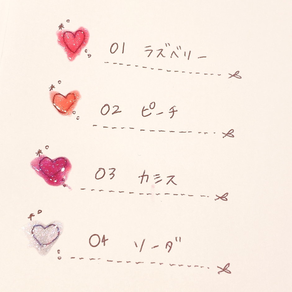ラズベリー、ピーチは細かさにアクセントをつけた多色ラメで透明感のある唇に。