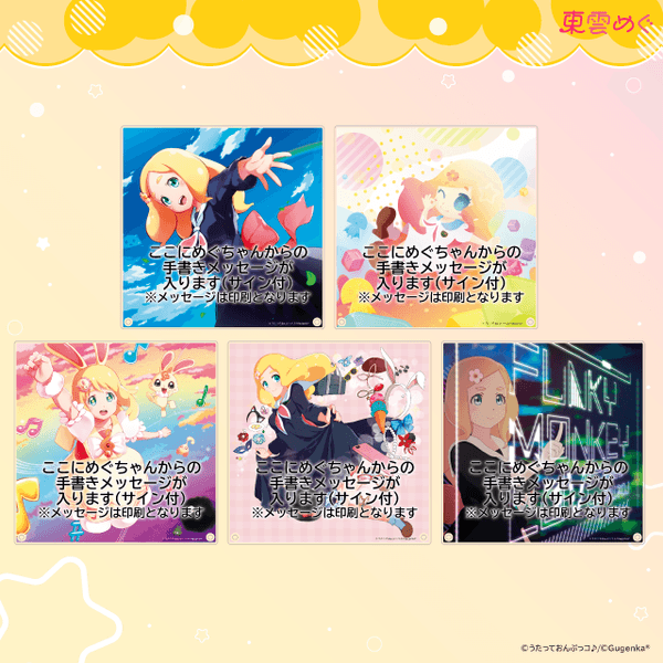 好きな背景イラスト(5種)と、めぐちゃんに送りたいコメント(3種)を選んで注文すると、選んだコメントに対するめぐちゃんからの手書きお返事メッセージが載ったアクリルスタンドが届きます(メッセージ、サインは印刷となります)。メッセージの内容は届いてからのお楽しみ。選べるイラストはこれまでリリースされた楽曲のジャケットなど5種。透け感のある大判のアクリルスタンドで、めぐちゃんからのメッセージをいつでも飾って楽しめます。予約受付期間は2020年4月10日〜2020年4月27日となります。