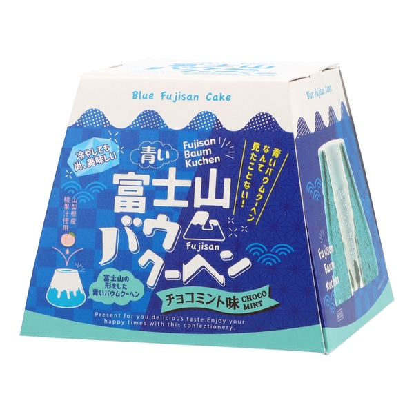 ■ 特徴 : 富士山型をしたバウムクーヘンで、バウムクーヘンの生地を青くすることによって富士山の山肌を演出、さらにホワイトチョコレートで富士山の雪を演出しよりリアルな富士山に見立てたバウムクーヘン。外側の山肌だけではなく、切った断面も鮮やかな青色となっています。