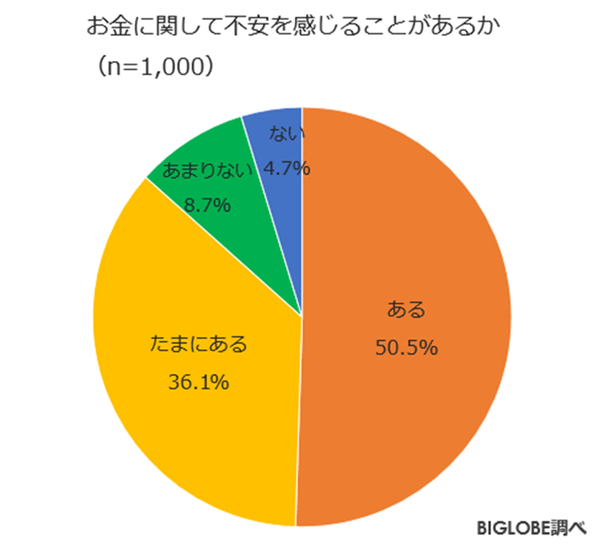 「お金に対して不安を感じることがあるか」という質問に対して、「ある」「たまにある」と答えた人が、あわせて86.6%というアンケート結果が出ています。また、不安があると答えた人に対して、その理由をたずねたところ、59.1%の人が「収入が少ない」、53.5%の人が「貯蓄や資産が少ない」と答えています。特に20代では収入が少ないと答えた人が69.2%と、約7割を超え、若い世代のお金に対する不安や不満が圧倒的に高いことがうかがえます。(出所:ビッグローブ株式会社「お金に関する意識調査」2019年)