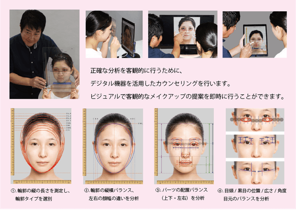 従来“美人の基準”と言われてきた黄金比率(ゴールデンバランス)をはじめとする顔分析理論を精査し、西洋人東洋人の区別なくあてはまる“顔分析新バランス基準”(特許認定)とそれを可視化するための独自の分析ツール「顔分析フィルム」(特許認定)を使ったカウンセリングを提供するものです。自分の顔の特徴を知りたい方、自分の顔に合ったメイクをしたい方、過去に顔分析を受けたけれど結果にしっくりきていない方等、「本当の顔を知ってキレイになりたい女性」のお手伝いができたら嬉しく思います。
