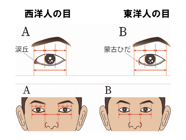 例えば、多くの東洋人の目頭には、西洋人には見られない蒙古ひだ(B)があり、白目の内側の涙丘というピンクの肉がひだで隠されている為、基準とされる 黒目の直径3倍幅の目幅より狭い方が大半です。