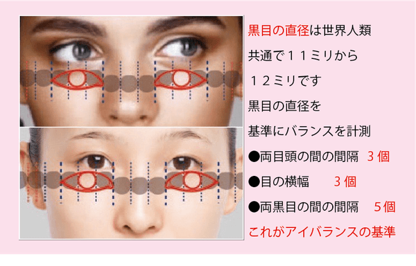 両目頭の間と目の横幅が等しいことが、目元の基準バランスと云われてきました。上のイラストA、B共に両目頭の間と目の横幅は等しいわけですが、Bの目元の印象は求心的 (寄り目)に見えます。