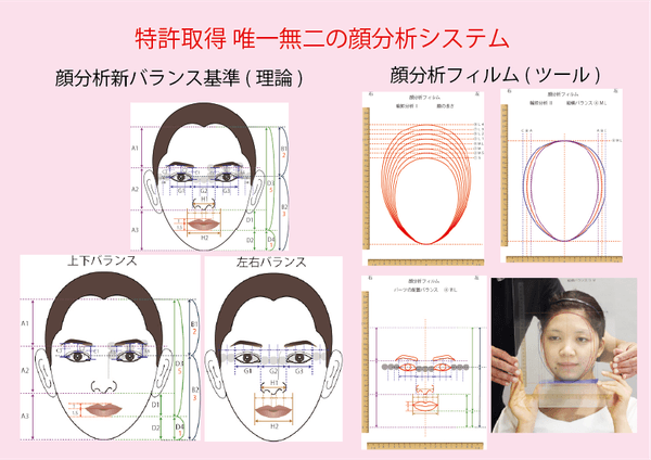 顔分析カウンセリングは、特許を取得した独自の分析ツール「顔分析フィルム」(特許認定)と、デジタル機器を活用し、顔型(輪郭)の大きさ・縦横のバランス・形状や、各パーツ(眉・目・鼻・唇)の配置・角度・形状を、客観的にビジュアル(画像)で基準との比較を見ていただき、ご自分の顔の特徴、個性を把握してもらうことができます。