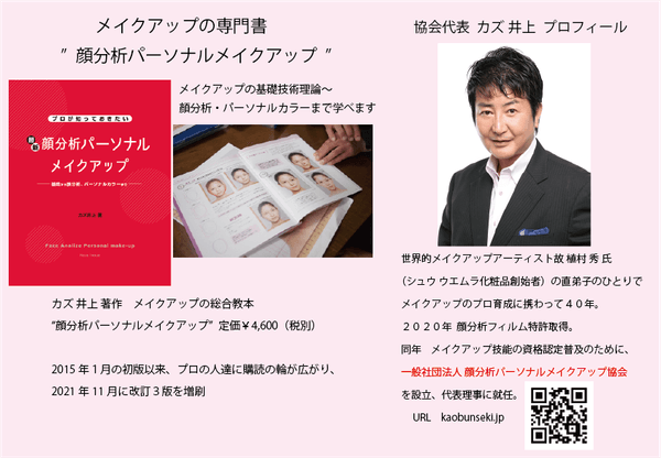 メイクアップ専門書籍「顔分析パーソナルメイクアップ」の著者であり、株式会社顔分析パーソナルメイクアップ研究所(東京都板橋区)の代表 カズ井上(井上和彦)は、『顔分析カウンセリング』と『パーソナルメイクアップ』のサービスを専門に行うメイクレッスンを10月1日より東京板橋区にて開始しました。特許取得をした顔分析フィルムを使用し、顔の特徴や自分に合ったメイクアップサービスを提供します。また指定の画像を送ることでオンラインカウンセリングも受講できます。 一般社団法人 顔分析パーソナルメイクアップ協会URL:https://kaobunseki.jp