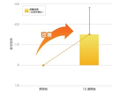 臨床実験開始前の状態を基準として、12週間後に医師による各被験者の皮膚炎状態の評価を行い、開始前からの変化を「-3:著効」「-2:有効」「-1:やや有効」「0:不変」「1:増悪」の5段階でスコア付けしました。その結果、日田天領水を摂取した試験品群の被検者では、有意に改善が見られました。加えて、被検者へのアンケートでも試験品群の被検者では、「かゆみ」「乾燥感」「ヒリヒリ感」「日常的な動きで感じる痛み」などの指標において、臨床実験実施前後の改善差を確認することができました。
