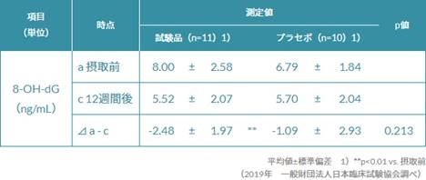 皮膚炎症状を悪化させる要因となる肌の酸化ストレスを定量的に評価する指標「8-OH-dG(DNA酸化損傷マーカー)」について、日田天領水を摂取した試験品群の被検者と一般のミネラルウォーターを摂取したプラセボ群の被検者を比較したところ、試験品群の被検者について「8-OH-dG」の値が減少する改善効果が確認されました。この「8-OH-dG」の値が低いほど、肌に対する酸化ストレスが少ないことを示しています。