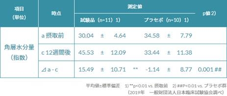 肌の角質に含まれる水分量は、肌の乾燥具合に影響する指標です。日田天領水を摂取した試験品群の被検者では、一般のミネラルウォーターを摂取したプラセボ群の被検者と比較して、角層水分量評価で明らかな水分量の上昇が見られ、肌の乾燥を抑止する肌の保湿効果が確認されました。