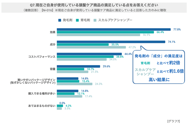 使用している頭髪ケア商品の「効果」「成分」「コスパ」に関する満足度は「発毛剤」ではより高い傾向に