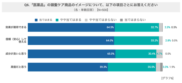 「医薬品」の頭髪ケア商品のイメージについて、 97.2%* が「効果が期待できる」、 97.2%* 「信頼(安心)して使える」、95.4%*「成分が良いと思う」と回答しており、ほとんどがポジティブな印象を持っていることが明らかになりました。一方で、94.8%*が高価だと思う」と回答していることから、高価なイメージがあり、購入に踏み切れないという方も多いのかもしれません。