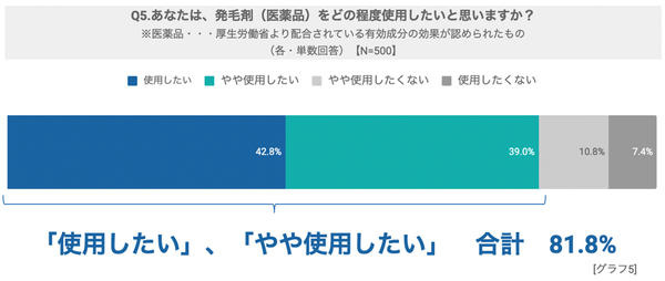 医薬品である発毛剤を使用したいか、という設問では、81.8%が「使用したい」と回答する結果になりました。頭髪ケア商品に高い効果や、より良い成分を期待する女性が多いことが伺えます。