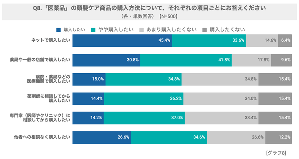 「医薬品」の頭髪ケア商品の購入方法について、今回の調査では79.0%*がネットでの購入を希望していることがわかりました。薬局や一般の店舗での購入についても、72.6%*が「購入したい」と回答しています。また、過半数の61.2%*が「他者への相談なく購入したい」と回答しており、購入の手軽さが求められていることが伺えました。
