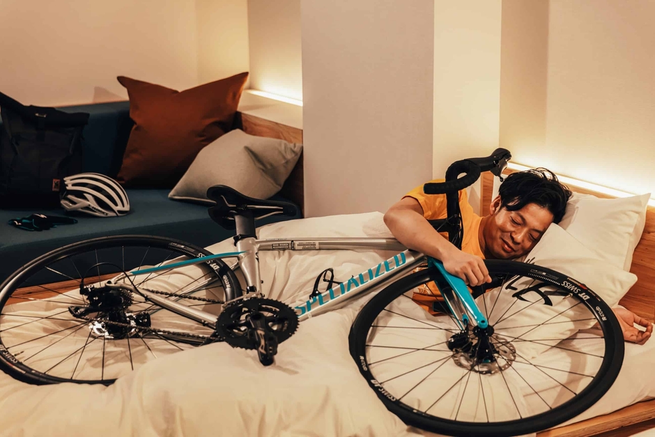 寝るときも愛車と離れたくない!そんな自転車への愛が止まらない人に向けたオプションのサービスです。汚れを弾く特殊素材の寝具を使うことで、大胆に自転車と添い寝ができちゃいます。あわせておすすめしたいのが、サイクルスーツ風の滞在着。これを着て、24時間オープンのパブリックスペース「TAMARIBA」へ行けば、自転車仲間が増えるかも。