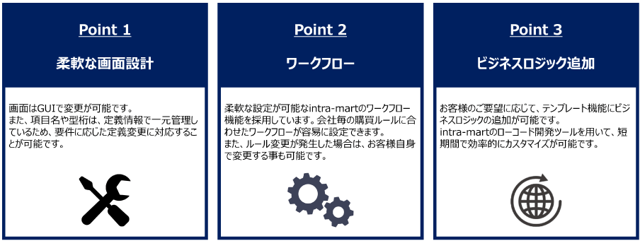 「ACT-iAP調達・購買テンプレート」は、購買業務で求められる見積管理、発注管理、納入・検収管理といった、調達購買業務に必要な一連の機能を網羅しています。さらに、これらの機能について「intra-mart」の特長を活かし、柔軟な追加開発や機能変更が可能となっています。