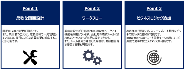 また、「intra-mart」をベースにローコード開発ツールを用いて構築されたテンプレート型ソリューションのため、お客様の要件に合わせて、入力画面のカスタマイズや入力先システムへの影響を与えないようなシステム間連携を柔軟に実装することが可能です。