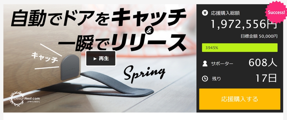 株式会社ウィズキュリオス(本社:福岡県福岡市/代表取締役:上崎 圭哲)は、しゃがまずに自動でドアをキャッチして、リリースも一瞬で済むドアストッパー【Spring/スプリング】をクラウドファンディングサービス「Makuake」にて、先行予約販売を開始してプロジェクトの支援者が600人を超えました。