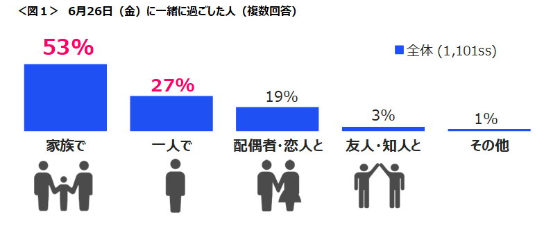“華金”(6月26日の夜)は「家族で」過ごした人が半数超、「一人で」は3割弱。<図1>