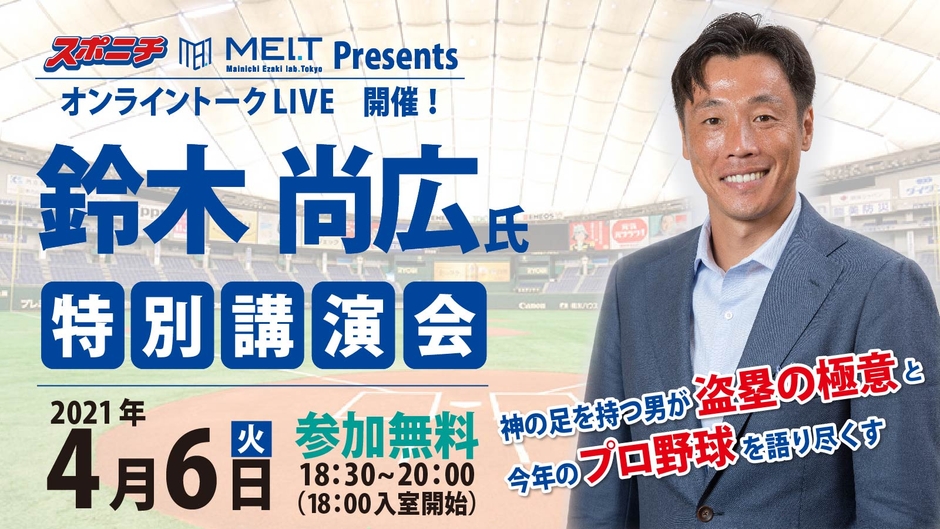 4月6日18時30分より「オンライントークLIVE」を開催いたします。盗塁成功率82.9%の神の足を持つ男、元巨人の鈴木尚広さんが登場。足のスペシャリストが盗塁の極意と今年のプロ野球を語りつくします。盗塁成功の秘訣や練習方法、早く走るためのコツや、長く在籍した巨人軍の裏話などここでしか聞けない話し盛りだくさんでお届けいたします。講演中には質疑応答の時間も設けています。是非この機会にご参加ください。
