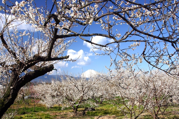 曽我梅林は神奈川県小田原市にあり、食用梅の生産農家が栽培する約35,000本もの白い可憐な梅の花が、富士や箱根の山々を背景に咲き誇ります。