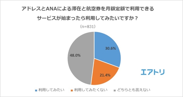 ANAによると月額4万円からの定額住み放題料金に加えて月額2万~3万円を支払うと全国の航空路線に2往復できるサービスを提供する予定とのことです。このサービスを利用してみたいか聞いたところ、「利用してみたい」が30.6%、「利用してみたくない」が21.4%、「どちらとも言えない」が半数近い48.0%となりました。