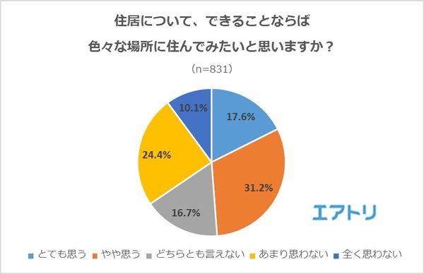 ―色々な場所に住むことに肯定的な人は48.8%(「とても思う」17.6%、「やや思う」31.2%)の一方で、否定的な人は34.5%(「あまり思わない」24.4%、「全く思わない」10.1%)となりました。
