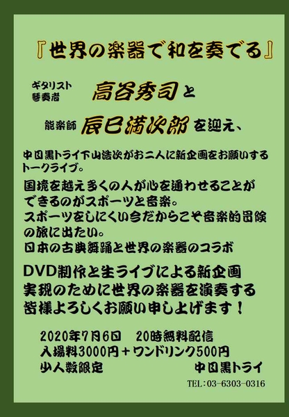 GODプロデュース配信イベント!世界を代表する「三神」のギターリスト「高谷秀司」と日本を代表する能楽師「辰巳満次郎」がコラボして中目黒トライより配信!