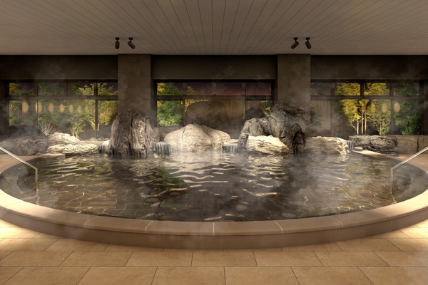 館内では、七絃の滝と四季折々の渓谷美を感じる半露天風呂や、塩原渓谷を思わせる自然の趣に満ちた岩風呂、深さ約110cmの湯船に立ったまま入る立ち湯がある浴場などがあり、湯めぐりをお楽しみいただけます。また、本館の大浴場はダークトーンの落ち着いた雰囲気にリニューアルするほか、洗い場には仕切りを設けるなど、使い勝手の良い清潔感溢れる空間に生まれ変わります。