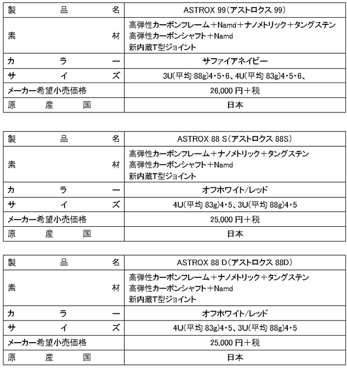 ヨネックス株式会社(代表取締役社長:林田 草樹)は、世界のトップランカーから厚い支持を受けるバドミントンラケット「ASTROX 99」「ASTROX 88 S」「ASTROX 88 D」の新デザインを2020年5月下旬より世界同時発売いたします。