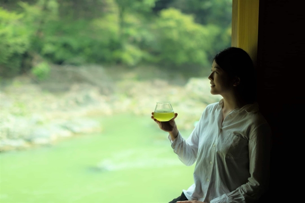 星のや京都のお茶は、利招園茶舗が監修しています。ラウンジでは京都の軟水で丁寧に水出しした「早緑(そうりょく)」という玉露を味わうことができ、館内を散策してお気に入りの場所を見つけたら、そこで抹茶を点てて楽しむこともできます。抹茶は、施設の前を流れる大堰川(おおいがわ)の澄んだ緑色にちなみ、また、旅の「記録」になるようにと「録碧(ろくへき)」と名付けられたオリジナルのものです。さらにバーではスモーキーないり番茶にウイスキーを合わせたカクテルで、さわやかな燻(いぶし)の香りを味わうことができます。星のや京都では、さまざまな場面でお茶を味わうことができます。