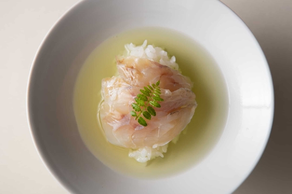 玉露は煎茶と比べ、より繊細な香りと透明感の強い色が特徴です。その香りと色をじっくりと楽しむために口を大きく広げた茶漬け碗で、鯛の昆布締めとともに味わいます。鯛の旨味で玉露のコクのある風味が引き立ちます。