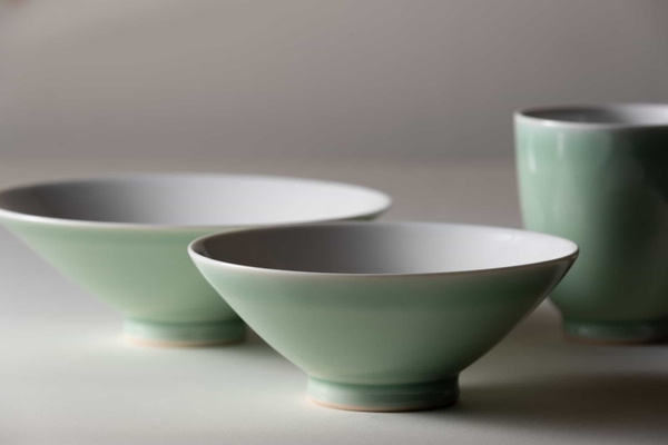 朝日焼を代表する朝顔形の湯のみをもとに制作した茶漬け碗です。朝顔が花開くような逆三角形の形が特徴で、煎茶の透きとおるような黄緑色がグラデーションとなって映えるよう計算されています。煎茶独特の渋みを含んだ旨味とちりめん山椒の爽やかな風味の組み合わせを楽しみます。