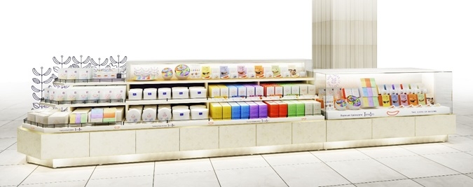 白木を基調とし、白ベースのパッケージと一体感を持たせ、アイアン装飾の特長的なモチーフで存在感を演出しました。また、商品の内容をご覧になりながら手に取っていただけるよう、棚什器上にサンプルを展示するケースをレイアウトしました。