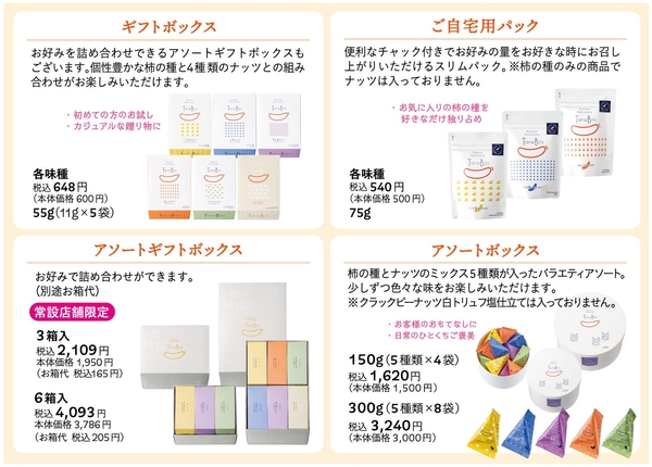 『タネビッツ』は個性豊かな柿の種と4種のナッツから成るラインアップです。カジュアルギフトにぴったりな「ギフトボックス」に加え、手土産やお客様のおもてなしにおすすめの柿の種とナッツのミックス5種を詰め合わせた丸型の「アソートボックス」や、お好きな量を楽しめる「ご自宅用パック」が新たに仲間入りしました。