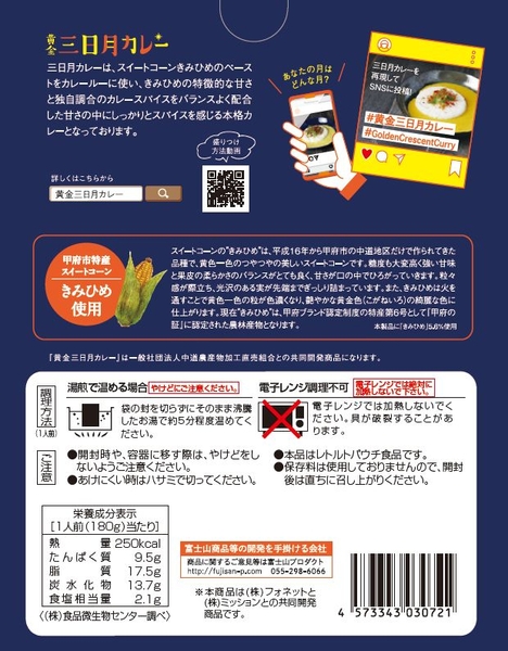 カレーライスの日である1月22日(水)に発売を開始する「黄金三日月カレー」は、富士山プロダクトと一般社団法人中道農産物組合との共同開発商品です。山梨県甲府市の中道地区だけで作られており、「甲府の証」に認定されているスイートコーン“きみひめ”の特徴を最大限に生かした、月をモチーフにした黄金色のカレーが誕生しました。