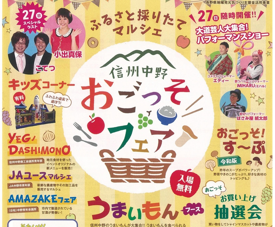 「信州中野おごっそフェア」は、長野県中野市で開催するおいしいものが食べられるイベントです。 「信州中野おごっそフェア」は、中野市の野菜・果物をはじめとした「食」をテーマに信州中野の魅力を発信するイベント。 食欲の秋におごっそを食べに信州中野へ、ぜひ、お越しください!