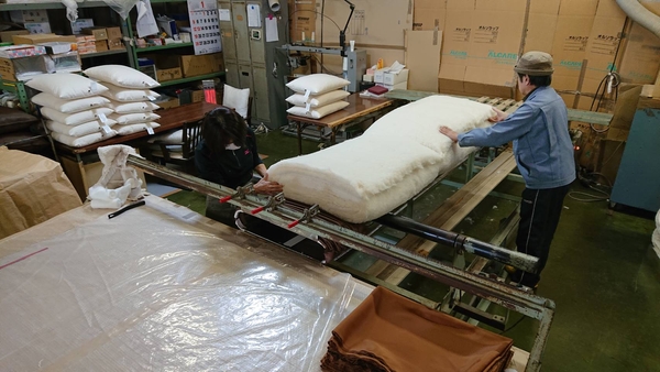 中綿3.0kgを充填工程です。ボリュームがある為、へたりにくい。