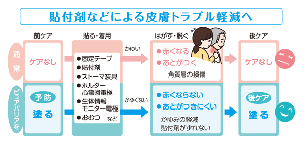 ピュアバリアはお顔を含む全身にお使いいただける保湿保護剤になりますが、元々は医療現場で固定テープや貼付剤による皮膚トラブル予防のために開発された製品です