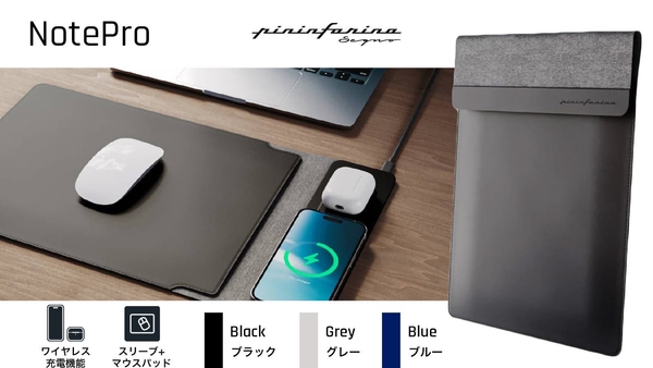 フェラーリのデザインで有名なピニンファリーナのライフスタイルブランド、「ピニンファリーナ セーニョ」から、ワイヤレス充電機能付きのノートパソコン用スリーブ「NotePro(ノートプロ)」