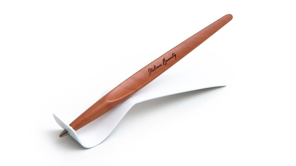 「PIUMA Ethergraf」は、梨の木を削り出したミニマルなボディに、金属合金製のインク不要の筆記チップ Ethergrafを搭載した次世代のスタイラス。紙に独自の筆跡を残すことで、“永く書き続けられる”という体験を実現します。白いスチール製の専用スタンド付きで、デスクに置くだけでも存在感を放ちます。