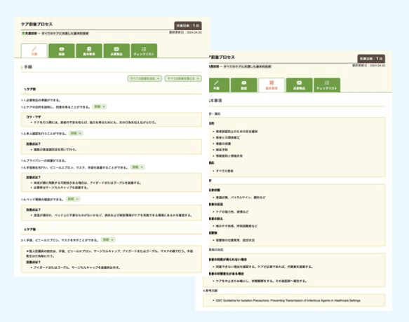 本サービスは看護の専門家チームならではの工夫が満載となっています。技術の進歩とともに目まぐるしく変化する医療と看護に対応できるように、技術映像、講義棟を最新情報に常に更新します。より効果的な学習と実践を考えて、複数の視点から確認が必要な看護技術について360度好きな角度で確認できる映像を随時追加!また、看護手順書と必要物品を集約したビジュアルポケットブックの提供等、臨床の現場で役立つコンテンツを提供していきます。