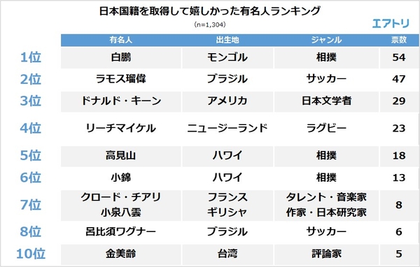 調査4:日本国籍を取得して嬉しかった有名人ランキングTOP10