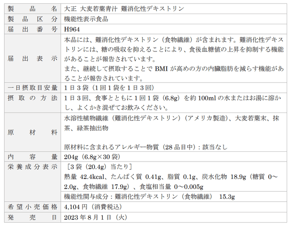大正製薬株式会社[本社:東京都豊島区 社長:上原 茂](以下、当社)は、2012年8月より発売をしていた特定保健用食品の「ヘルスマネージ大麦若葉青汁〈難消化性デキストリン〉」を、2023年8月より機能性表示食品「大正 大麦若葉青汁 難消化性デキストリン」としてリニューアルし、発売いたします。