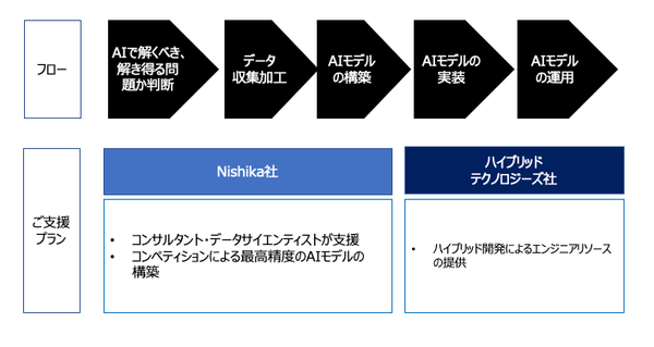 近年お客様より、どの分野にAIモデル開発をするのが最も効果的なのか?などAIモデル開発のご相談を受ける機会が増えていました。そこで、高精度なAIモデル開発を行うことを得意とするNishika社と提携し、ハイブリッドテクノロジーズ社のハイブリッド開発による価格優位性と人的リソース力、Nishika社のAIモデル開発力を融合し、新たなサービス『ワンストップAI開発』を開始することとなりました。