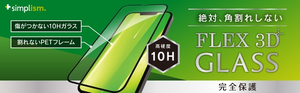 Simplismの人気No.1[FLEX 3D]シリーズ。強化ガラスとPETフレームの複合構造のガラスプロテクターです。強化ガラスで画面を保護し、端末形状に沿った立体成型のPETフレームが周りを覆うことで、角からの落下や衝撃で起こる角割れを防ぎます。